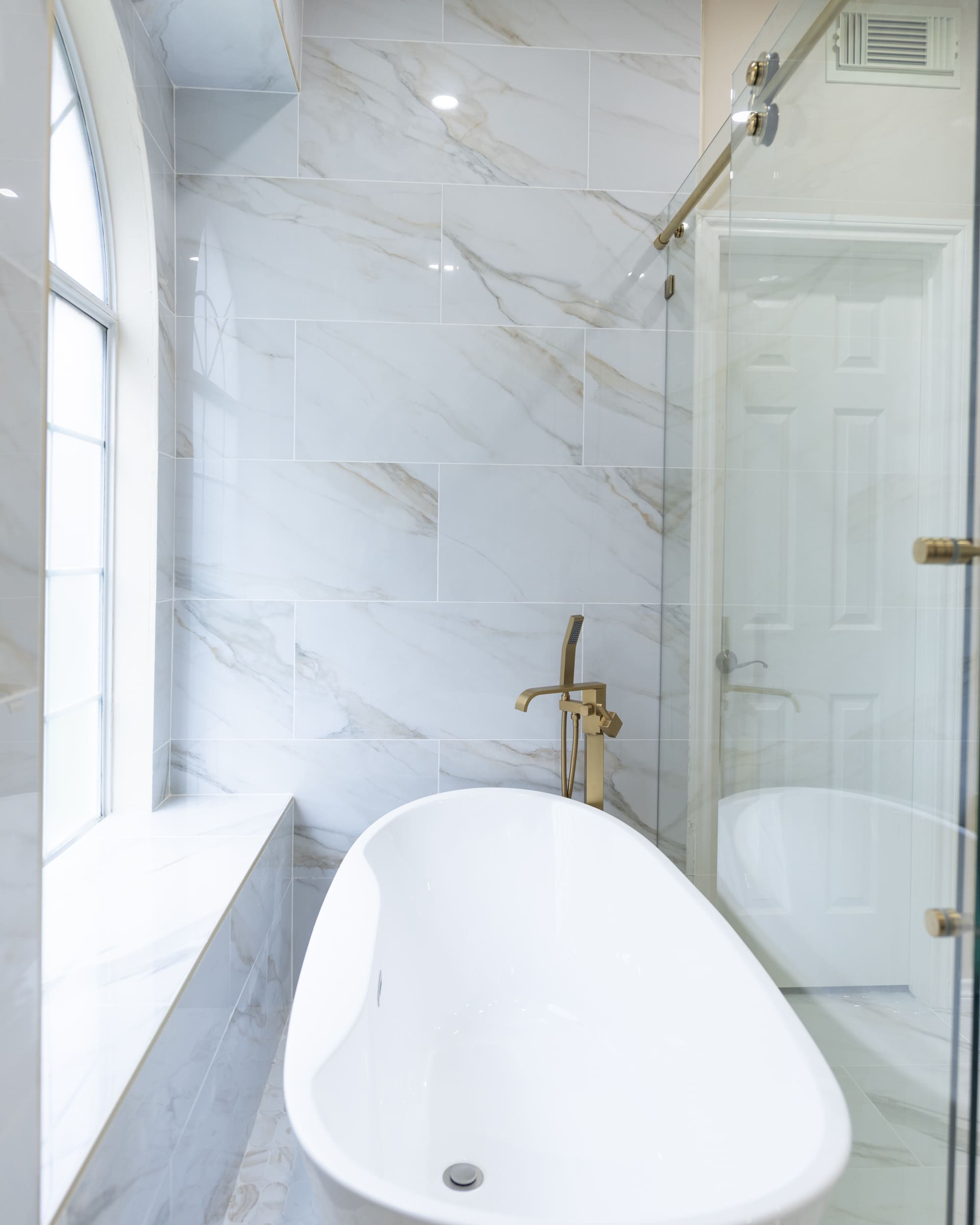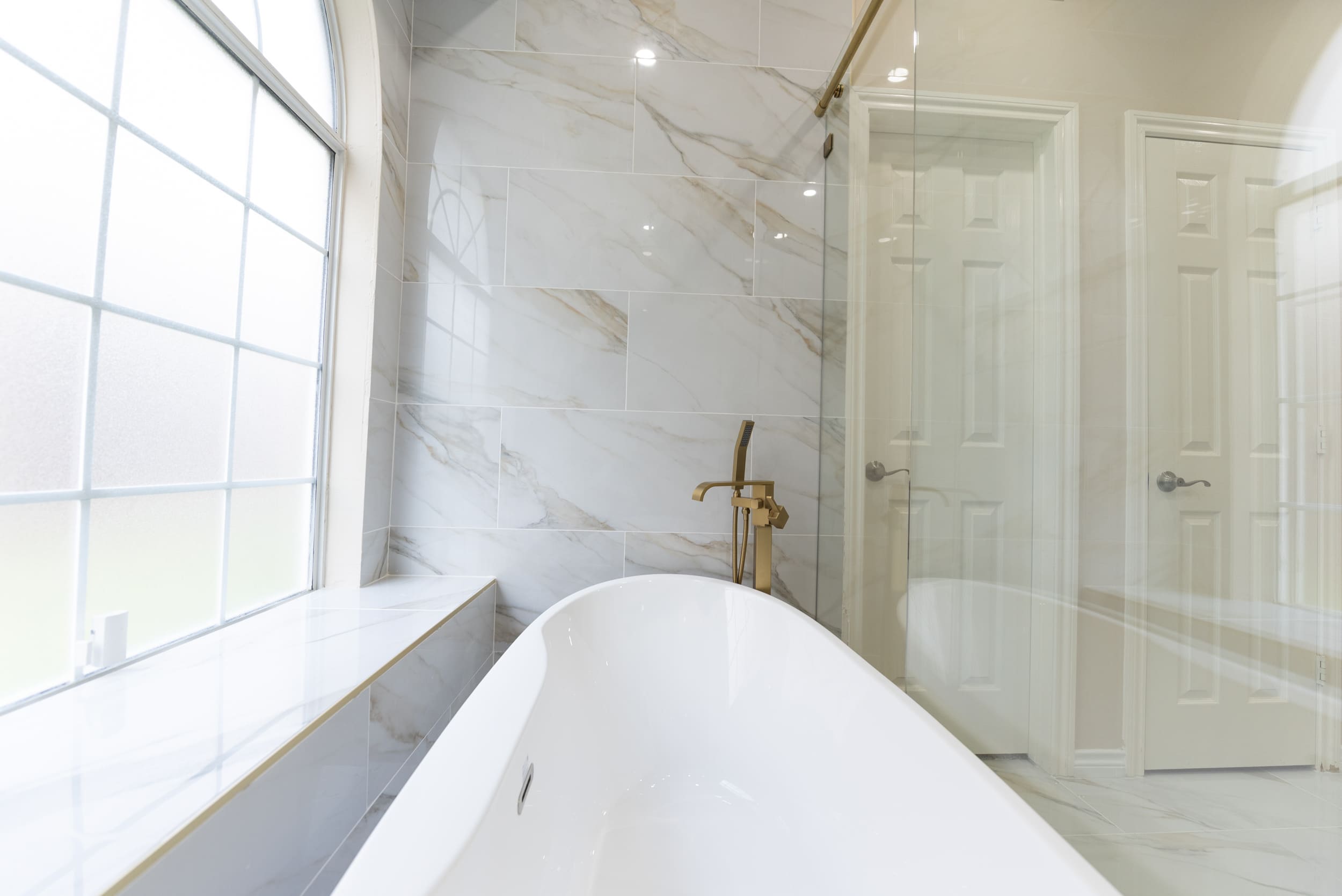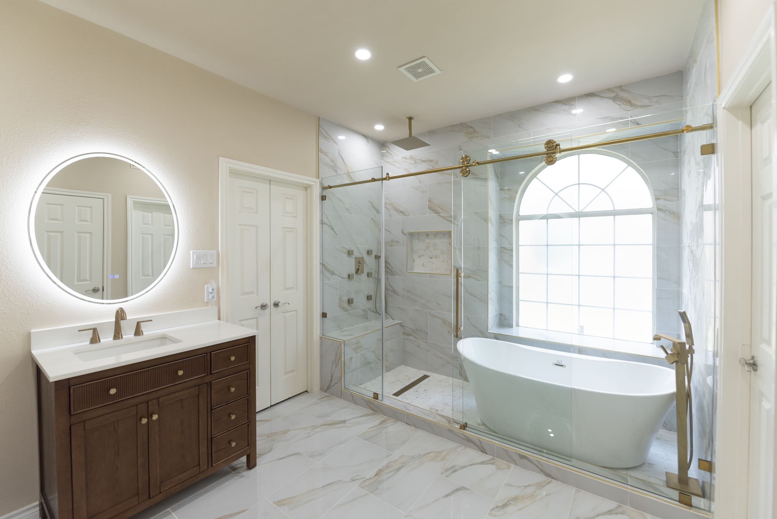 This Cypress bathroom renovation balances luxury with practicality—easy-clean surfaces, smart storage, and quality fixtures that last.