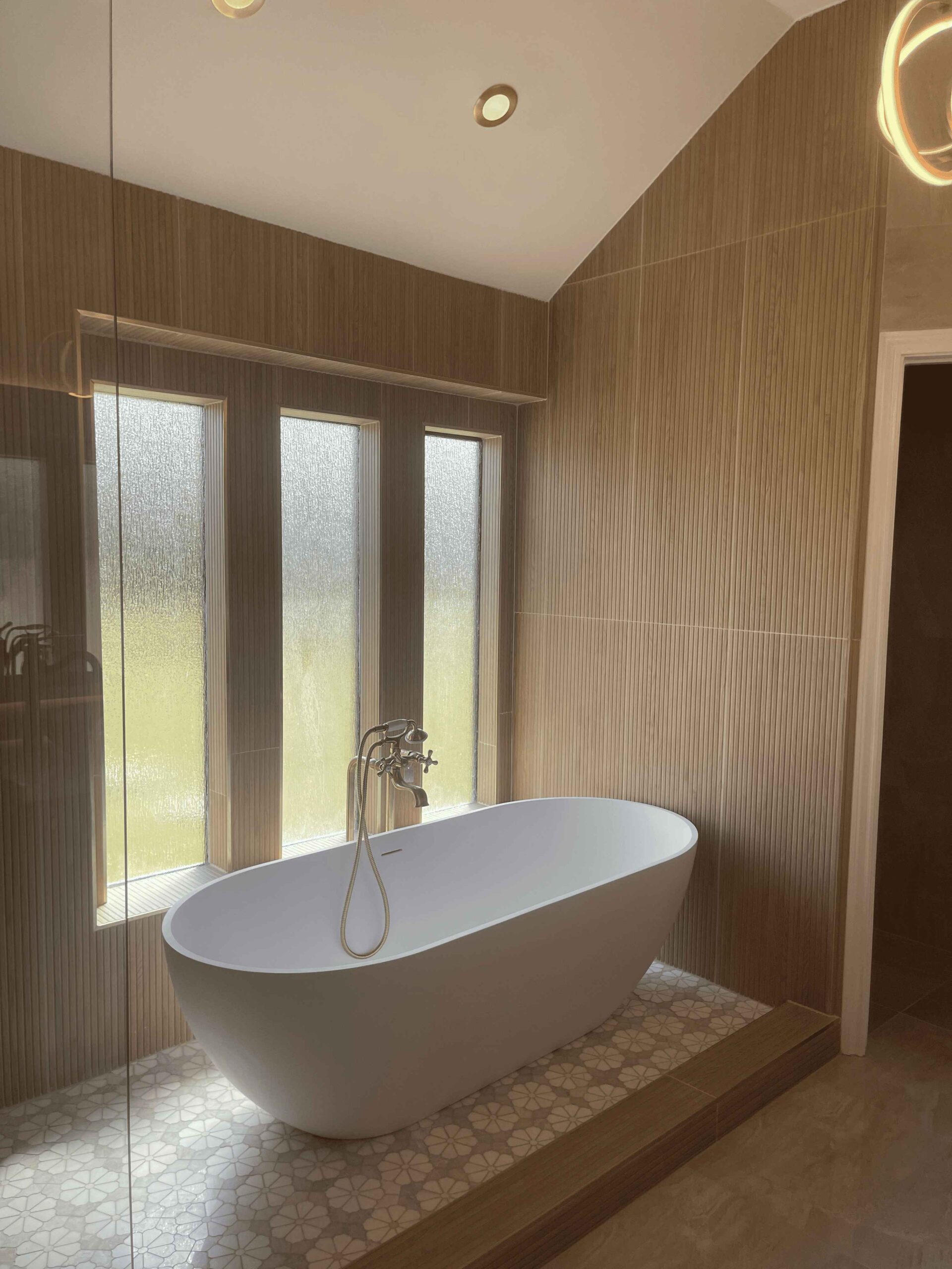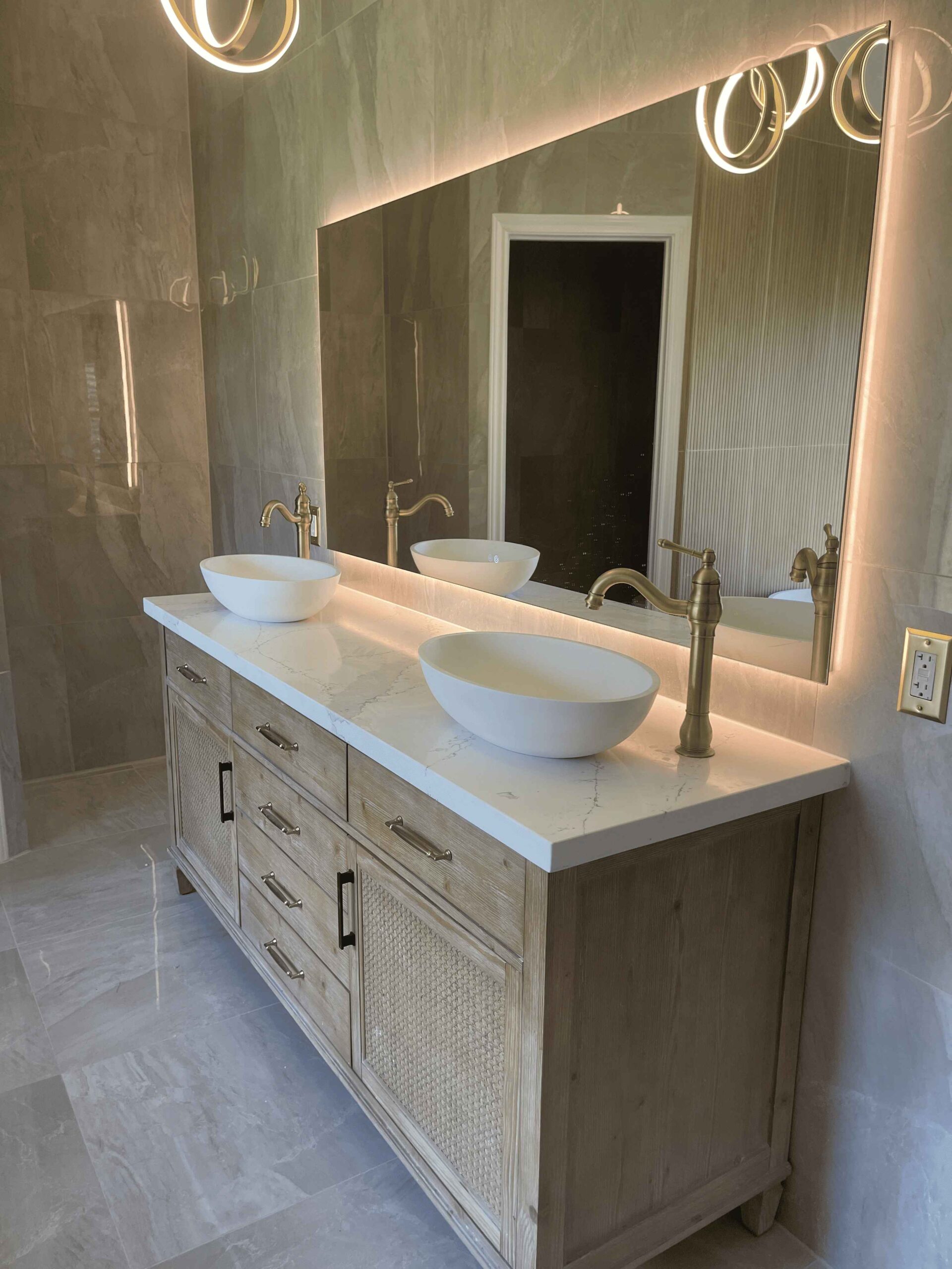 Our client wanted a bathroom that felt like a luxury hotel while staying easy to maintain for everyday use. We designed a Richmond bathroom remodel that combined natural textures, gold accents, and smart lighting for a space that feels welcoming, functional, and timeless.